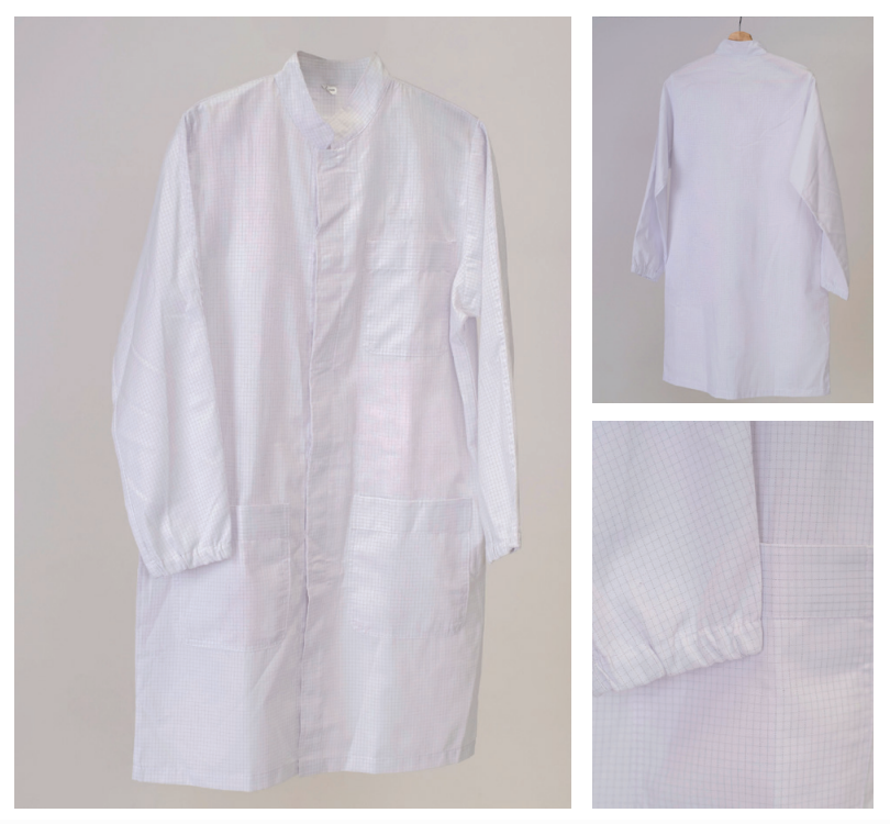 · Bata antiestática con cuello maho. Manga larga con puño de goma elástica bastillado. Lleva tejido de rejilla axilas.