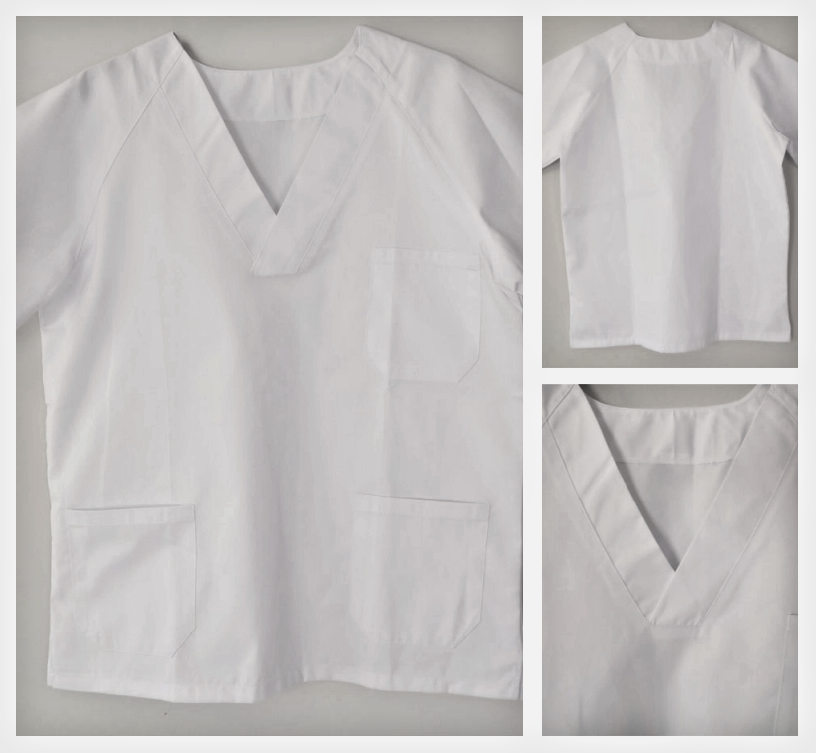 · Casaca antiestática con cuello de escote pico. Manga corta. Dos bolsillos de plastrón con abertura en cintura + un bolsillo de plastrón en pecho izquierdo con abertura.